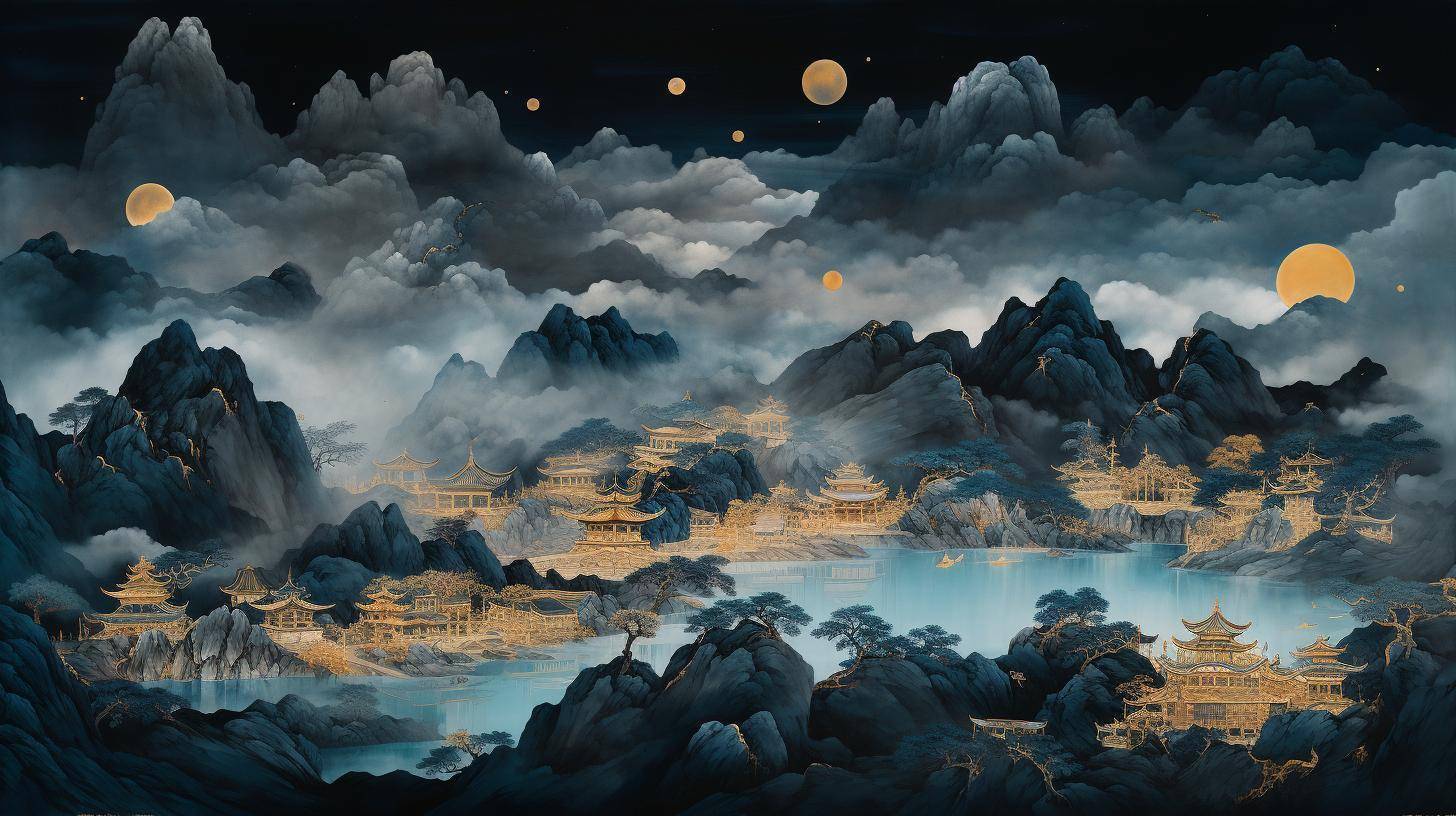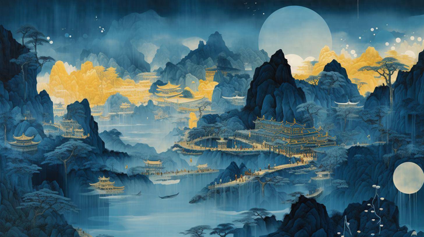 烟霞缭绕的宋代山水间,机械飞鸟掠过,幽蓝霓虹渗出青灰色山峦,这不是科幻场景,而是当下热点的“未来山水”艺术本质。